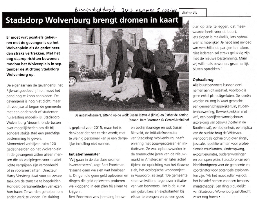 In de Binnenstadskrant van november 2013 staat een artikel over het initiatief Stadsdorp Wolvenburg. Buurtgenoot Elaine Vis heeft de initiatiefnemers geïnterviewd en Gerard Arninkhof zorgde voor een bijpassende foto.