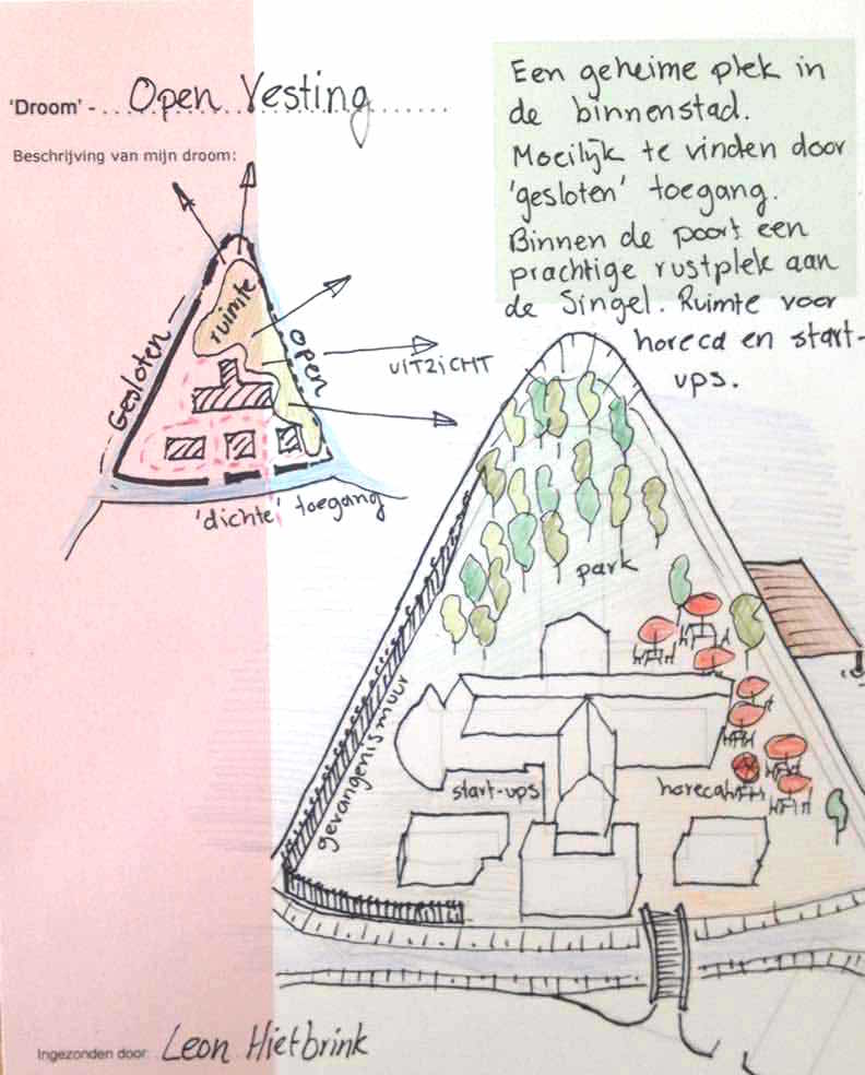 De tekenwedstrijd -uw eigen droom bolwerk- heeft tot een overzichtelijk aantal inzendingen geleid. Winnaar is geworden Leon Hietbrink met zijn tekening van een ‘Open Vesting’: een geheime plek in de binnenstad, moeilijk te vinden door de ‘gesloten’ toegang.